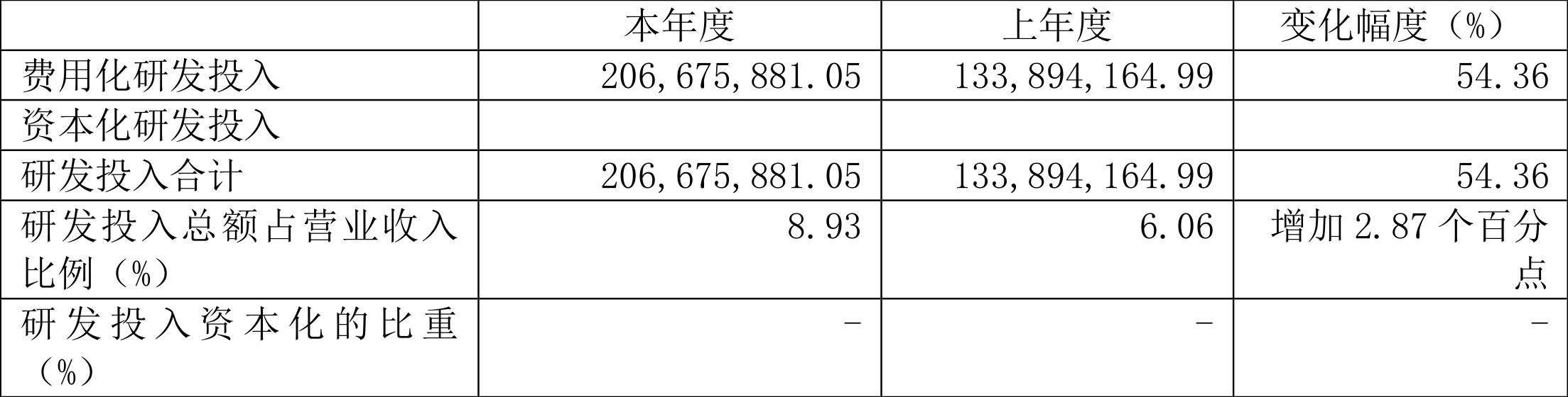 2022年全年,公司研发投入金额为2.07亿元,同比增长54.36%;研发投入占营业收入比例为8.93%,相比上年同期上升2.87个百分点。