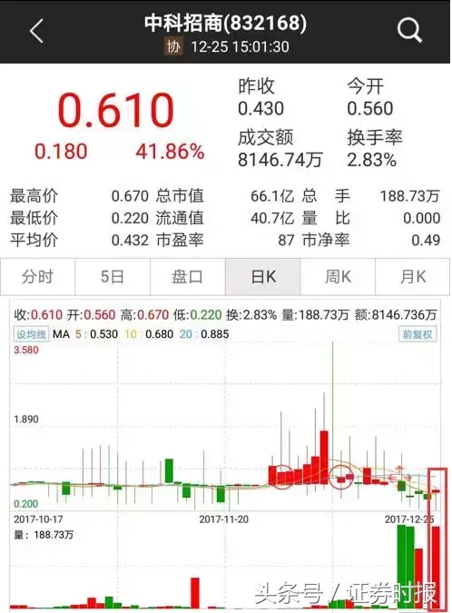 股价上,中科招商继续巨幅震荡,在股转的最后一刻价格定格在0.61元,较上一转让日大涨41.86%。