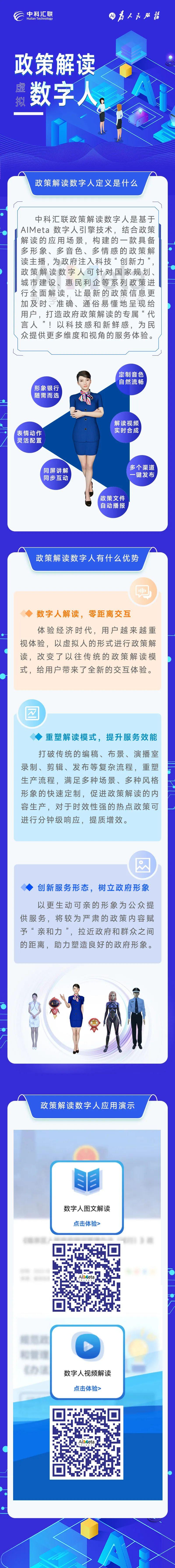 在行业应用层面的公共服务领域,中科汇联参与申报了政策解读数字人政务行业解决方案。是基于中科汇联自主研发的AiMeta数字人引擎技术,结合政策解读的应用场景,构建的一款具备多形象、多音色、多情感的政策解读主播,为政府注入科技“创新力”,政策解读数字人可针对国家规划、城市建设、惠民利企等系列政策进行全面解读,让最新的政策信息更加及时、准确、通俗易懂地呈现给用户,打造政府政策解读的专属“代言人”!以科技感和新鲜感,为民众提供更多维度和视角的服务体验。