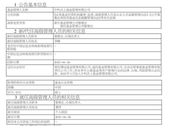 中国经济网北京6月27日讯 今日,中科沃土基金管理有限公司发布基金行业高级管理人员变更公告,公司督察长及合规负责人曹萍离任,李峰接任。