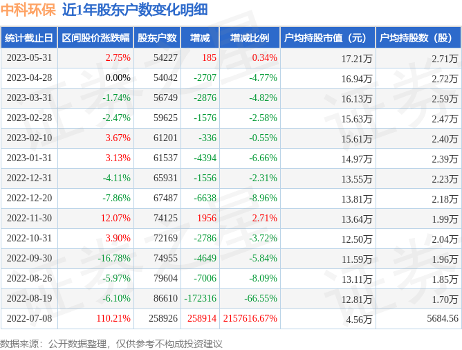 从股价来看,2023年4月28日至2023年5月31日,中科环保区间涨幅为2.75%,在此期间股东户数增加185.0户,增幅为0.34%。