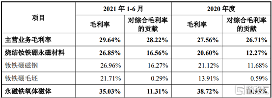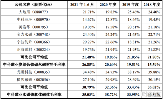 2018年至2021上半年公司与同行业可比公司烧结钕铁硼永磁材料、永磁铁氧体磁体毛利率比较,图源,招股书