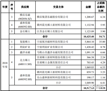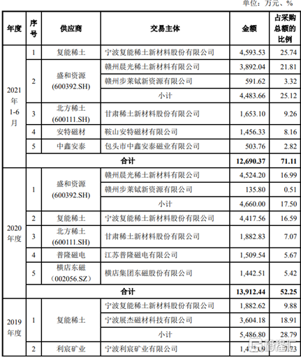 报告期内,公司主要供应商包括宁波复能稀土新材料股份有限公司、赣州晨光稀土新材料有限公司、赣州步莱铽新资源有限公司、甘肃稀土新材料股份有限公司等。公司前五大供应商采购合计金额分别为1.05亿元、1.04亿元、1.39亿元和1.27亿元,占采购总额比例分别为64.18%、54.71%、52.25%和71.11%,前五大供应商集中度较大。若公司与主要供应商相互之间合作终止,可能对公司正常的生产经营造成不利影响。