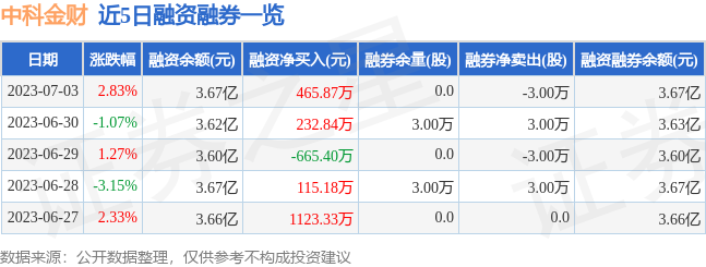 中科金财融资融券信息显示,融资方面,当日融资买入1743.68万元,融资偿还1277.8万元,融资净买入465.87万元。融券方面,融券卖出0.0股,融券偿还3.0万股,融券余量0.0股,融券余额0.0万元。融资融券余额3.67亿元。近5日融资融券数据一览见下表: