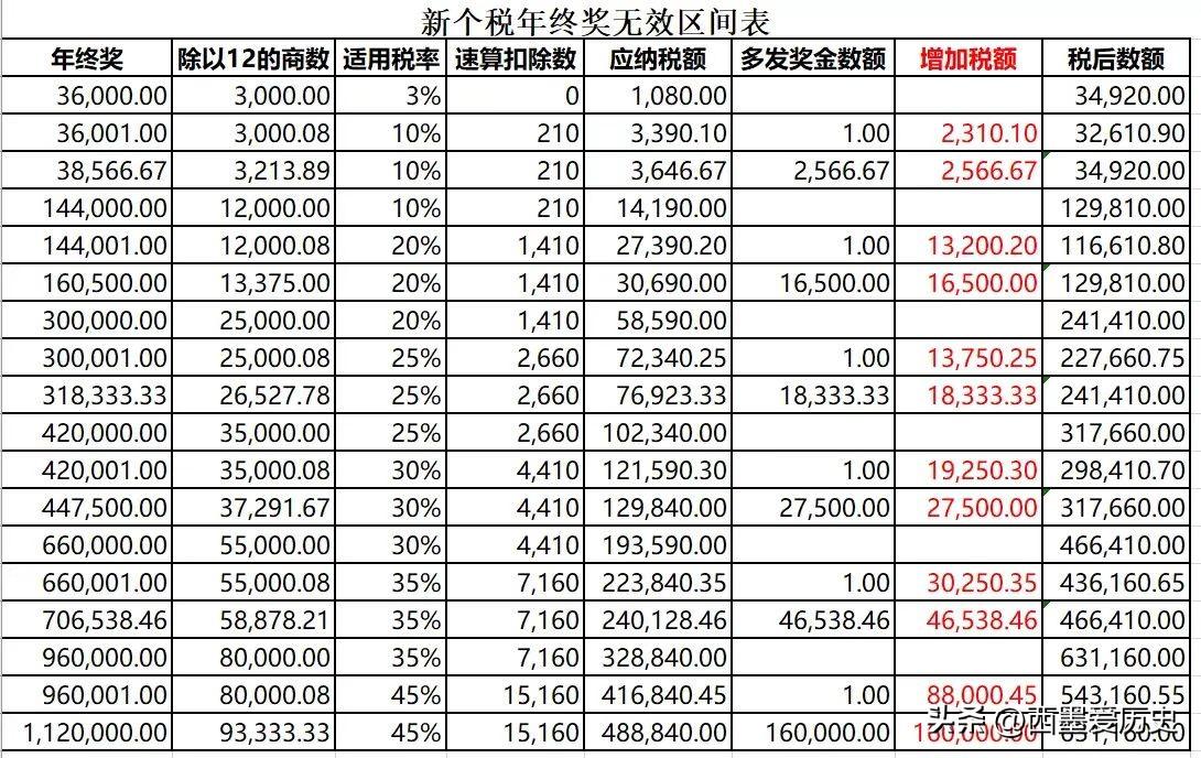 年终奖金无效区间参考表