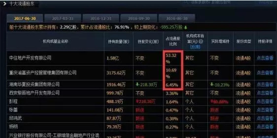 中房地产(000736)总市值为48亿元,那么真实流通市值=48*(1-53.32%-10.69%-6.45%)≈14.18亿
