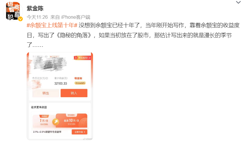 今天,看到紫金陈的这条微博,才意识到余额宝已经10岁了。