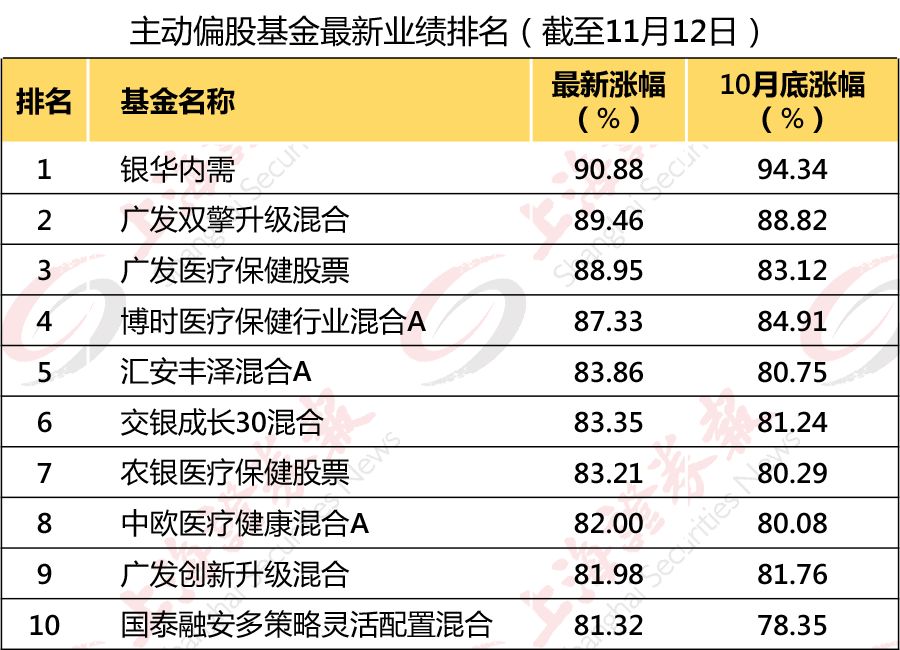 主动偏股基金最新业绩排名(截至11月12日)