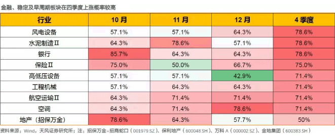 统计结果显示,四季度表现较好的行业集中、业绩经营比较稳定及早周期板块,上涨概率达到70%以上的行业包括风电设备、水泥制造、银行、保险、高低压设备、工程机械、航空运输、空调等行业。