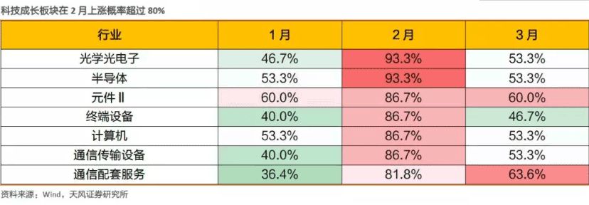 在春季行情方面,天风证券表示,虽然上述业绩稳定的板块在前期保持占优,但进入2月后,元件、半导体、计算机、光学光电子、通信传输设备、通信配套服务、终端设备等科技成长板块显著好于其他板块。值得关注的是,上述行业在2月当月的上涨概率高达80%以上。