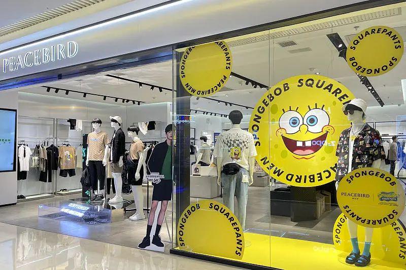 2022年6月6日,北京龙湖长楹天街购物中心,太平鸟男装联名海绵宝宝IP的橱窗设计。图/视觉中国