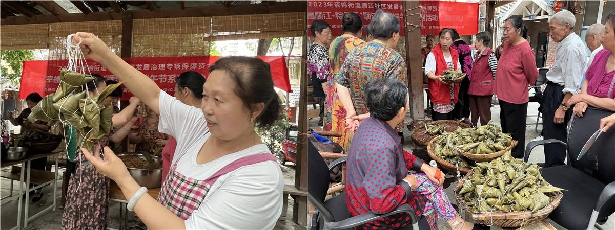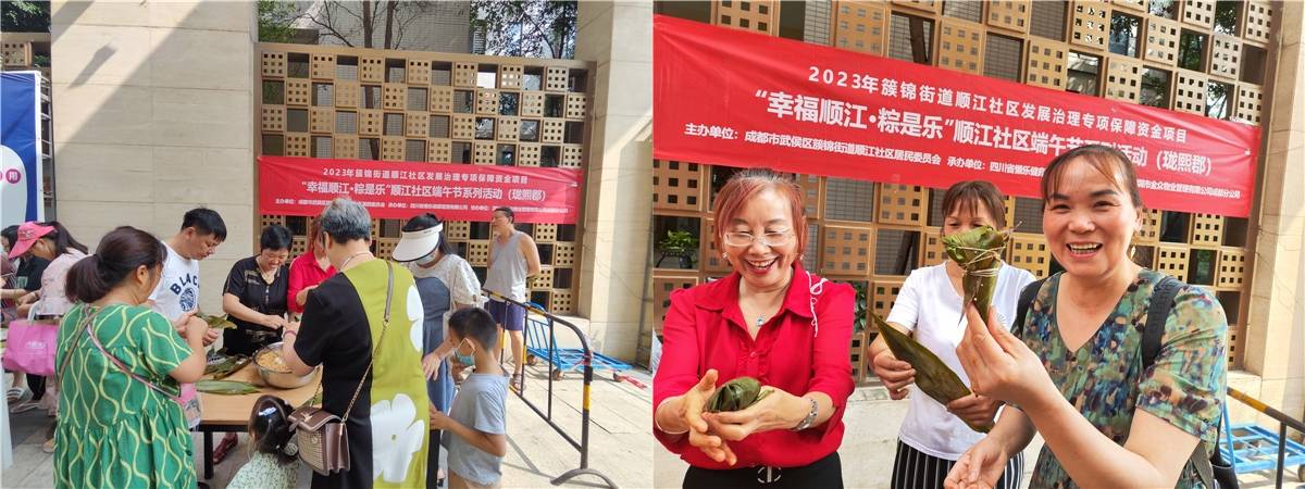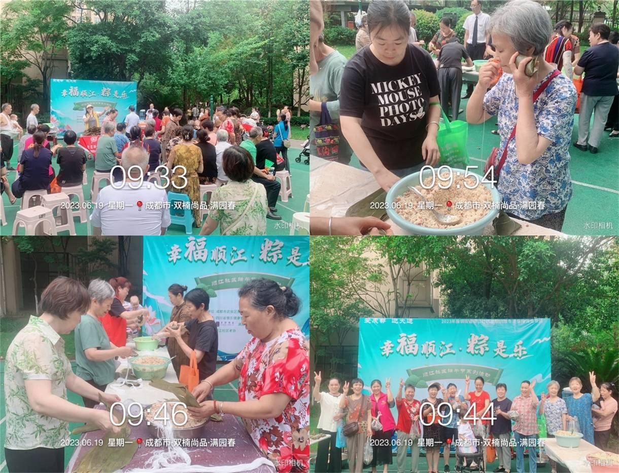 2023年6月19日上午9:00-12:00,由成都市武侯区簇锦街道顺江社区居民委员会主办,四川省懒乐健康管理有限公司承办的簇锦街道顺江社区2023年社区发展治理专项保障资金项目-幸福顺江“我们的节日”系列氛围营造活动之“幸福顺江·粽是乐”端午节系列活动在社区辖区内10个院落同时举行(即保利花园1、2、3、4期、花园城内侧、华宇静苑、满园春、中铁瑞城三号线、置信花园城外侧、珑熙郡、顺江嘉苑小区、顺江锦苑小区、顺和苑小区),活动联动辖区物业公司(保利花园、中铁二局瑞城物业三号线、蜀信物业花园城内侧、雅生活置信花园城外侧、深圳市金众物业管理有限公司成都分公司、重庆华宇物业、永祥物业)七家企事业单位共用参与,活动收益群众达到上千人。
