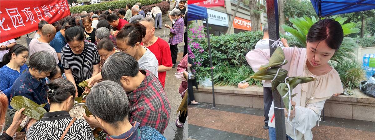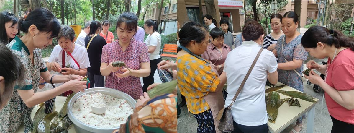 (上图为置信花园城外侧小区包粽子活动现场以及自组织队伍现场表演)