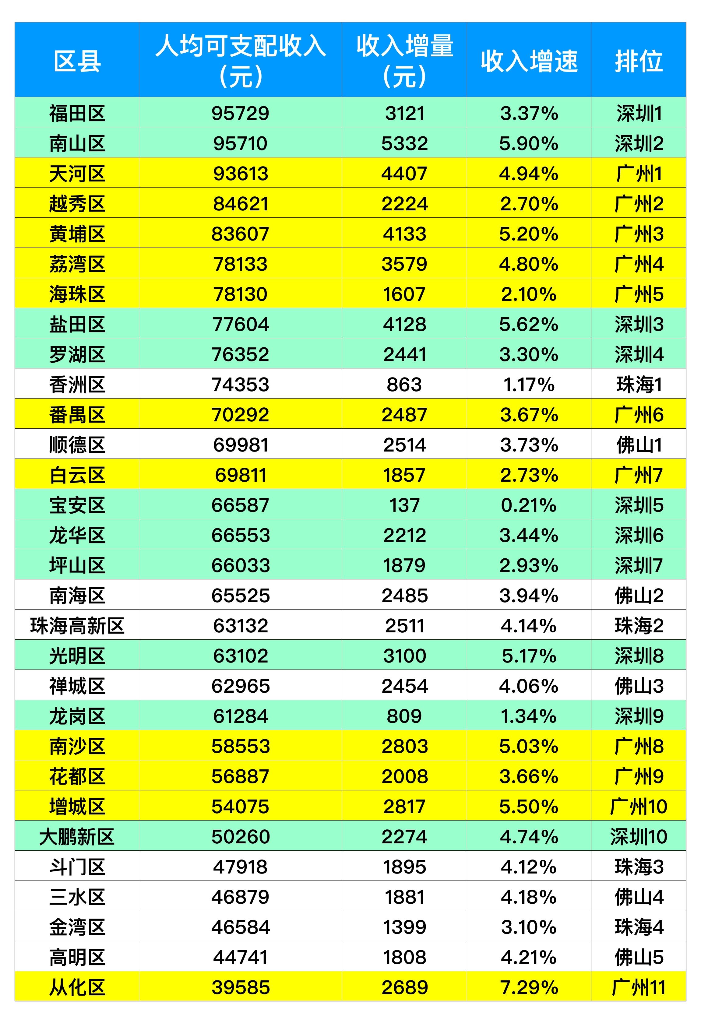 “广深珠佛”四城的下辖各区2022年度人均收入状况,请看下图: