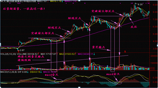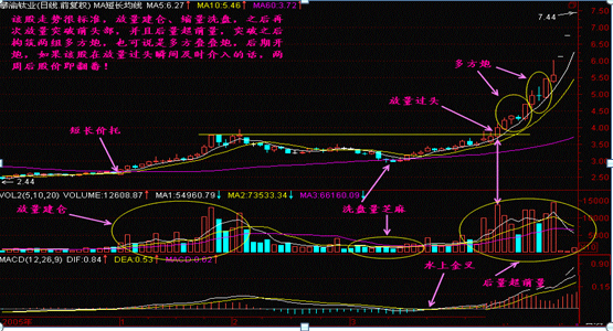 图形特征:(1)股价呈波浪形上升,如果后面的上升浪成交量比前面的上升浪成交量大,称为后量超前量。(2)后一浪放量上升时,如股价正好通过前一浪顶部,则股价还会涨。