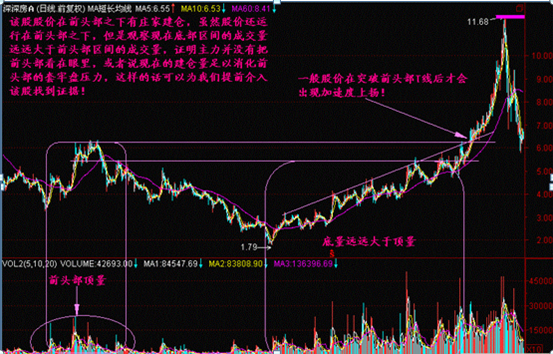前头部的成交量称为顶量,而现在低位的成交量称为底量,顶量处一定有套牢盘,当股价从低位上涨至前头部顶量区间时套牢盘会挣扎解套出局,如果现在的底量没法超过顶量的话,将对行情的发展造成不利局面。股价要想向上涨必然要克服前头部压力,也唯有现在底部的建仓量能够超过前头部的套牢量时,才能证明庄家的确有这个实力和信心去把前头部打通!