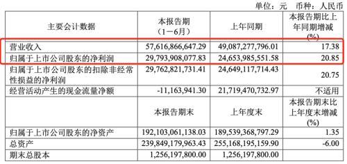 具体而言,2022年上半年,贵州茅台实现营业收入576.17亿元,同比增长17.38%;实现归母净利润297.94亿元,同比增长20.85%。初步计算,贵州茅台在上半年日赚约1.65亿元。