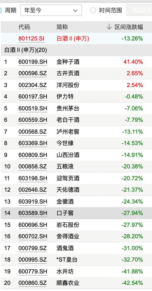 申万白酒指数20家公司中,只有三家年内股价波动为正,金种子酒年内大涨41.2%,古井贡酒累计涨幅2.65%,洋河股份累涨2.54%。