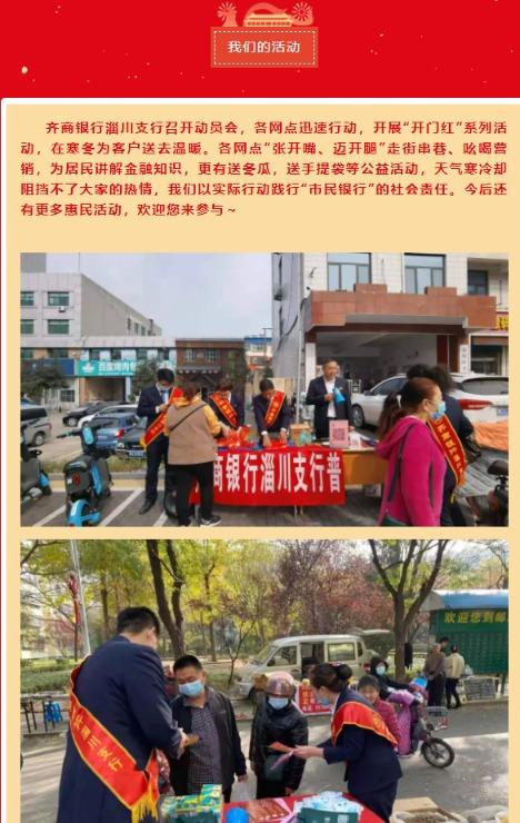 银行员工也是非常给力。齐商银行淄川支行在召开动员会之后,各网点“张开嘴、迈开腿”走街串巷、吆喝营销,为居民讲解金融知识,还开展了送冬瓜、送手提袋等公益活动,激发诸多客户热情。