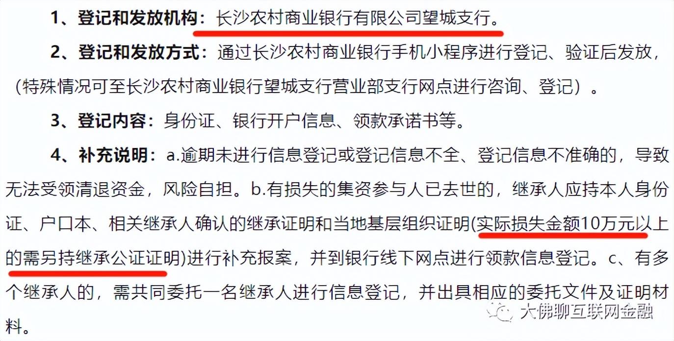 如果有继承人代领的,需要到银行线下网点进行领款信息登记,实际损失金额在10万元以上的需另持继承公证证明。