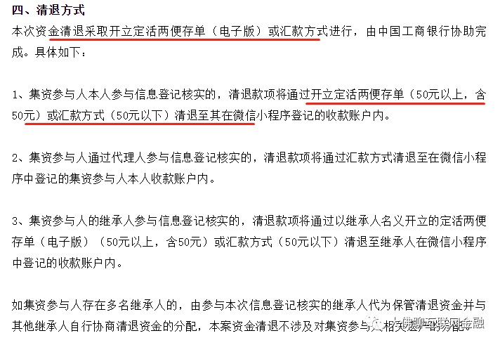 退赔方式:这次清退金额在50元及以上采取开立定活两便存单方式,50元以下采用汇款方式进行,由工行协助完成。