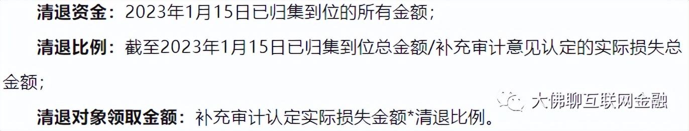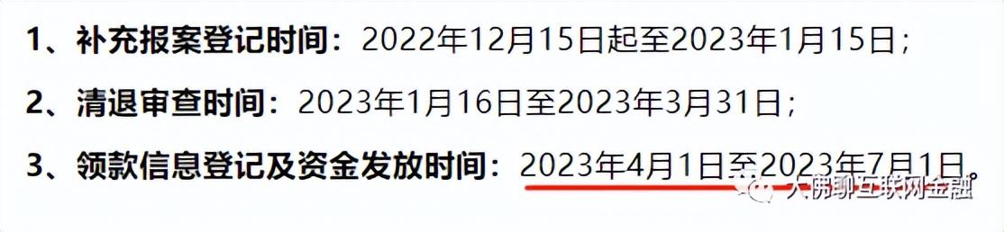 补充报案登记为2022年12月15日至2023年1月15日,清退审查时间为2023年1月16日至2023年3月31日。这次退赔的对象是已经报案登记并已补充审计认定损失的参与人,逾期未登记将不纳入本次退赔范围。