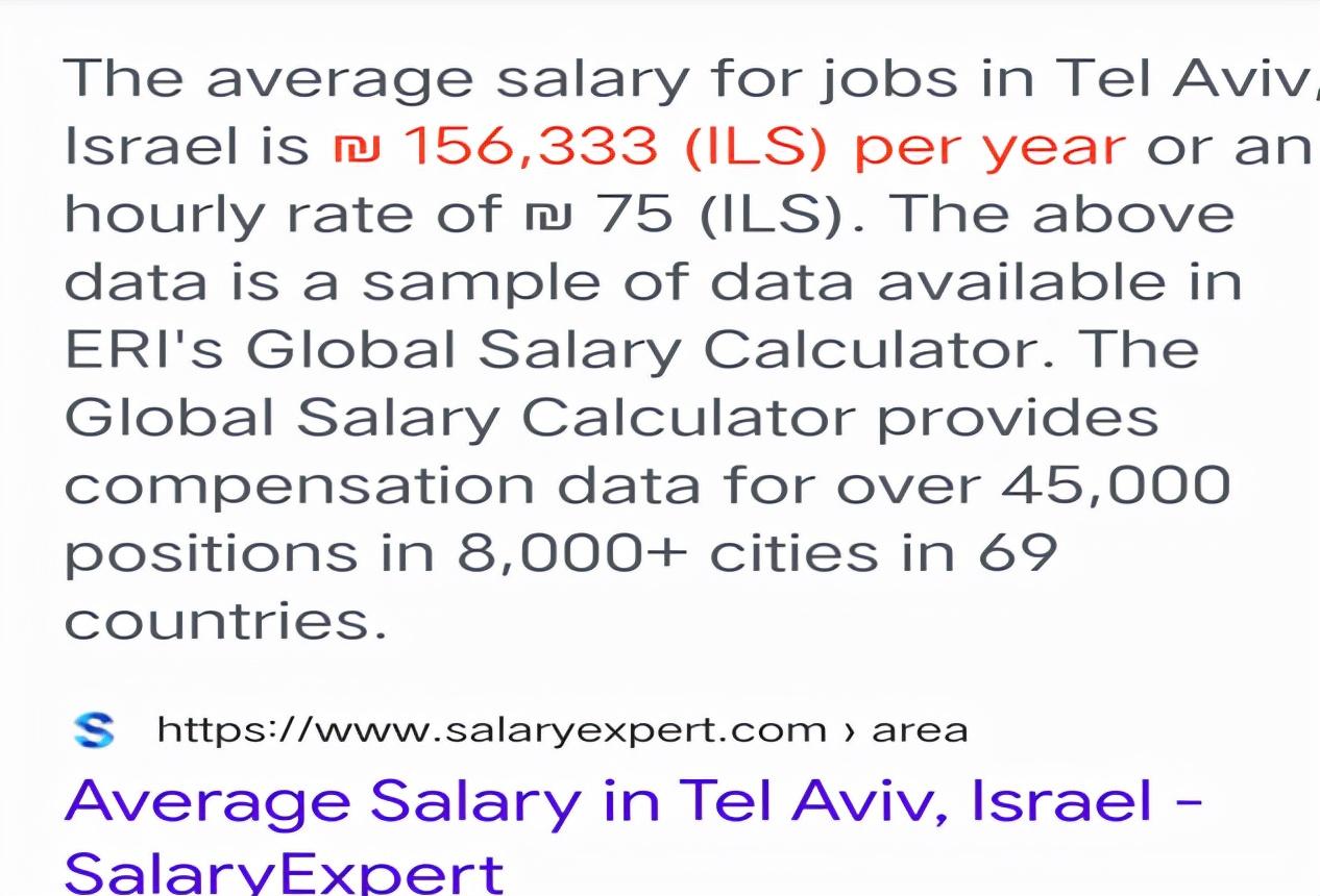 而根据专业的国际薪资调查网站Salary Expert的调查结果显示,特拉维夫的工薪阶层平均年薪大概是15.6万谢克尔,平均时薪是75谢克尔。
