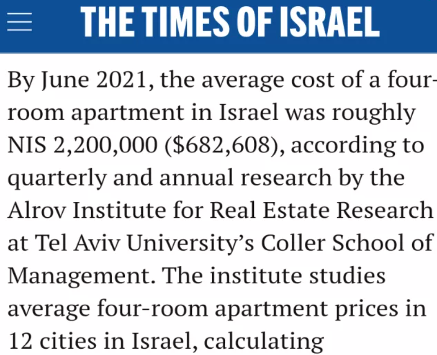 据《以色列时报》报道称,在特拉维夫,一套四居室公寓的平均价格是68.2万美元。