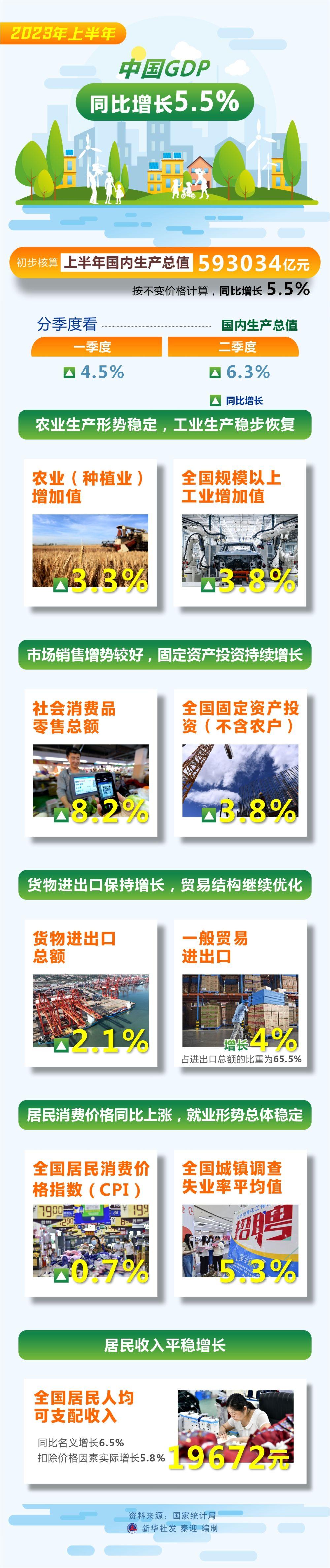 翻开半年报,国内生产总值比去年同期增长5.5%,社会消费品零售总额同比增长8.2%,第三产业增加值同比增长6.4%……多项指标显示,我国经济运行延续恢复向好态势,同时物价、出口等部分指标增速放缓也引发关注。