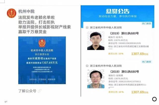 此外,去年12月,赵锐勇父子被银行悬赏千万追债刷遍朋友圈,自2017年开始,“长城系”的公司以应收账款为质押,陆续从该银行贷款1亿多元。今年6月29日,长城影视公告的杭州仲裁委员会《裁决书》显示,长城影视全资子公司须在十日内向建设银行西湖支行支付全部资产收益权回购基本价款12997.4万元、回购溢价款229.48万元,违约金52.91万元,合计约1.33亿元。不过,截至还款最后期限,这笔上亿的债权,银行也只追回300万左右。