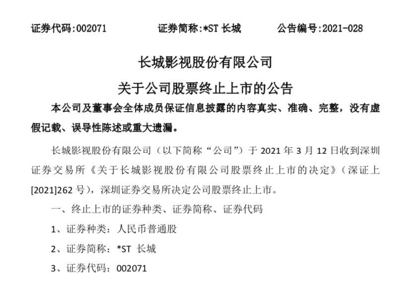 公告称,长城影视自2021年3月22日起进入退市整理期。退市整理期的期限为三十个交易日,退市整理期届满的次一交易日,深交所对公司股票予以摘牌。