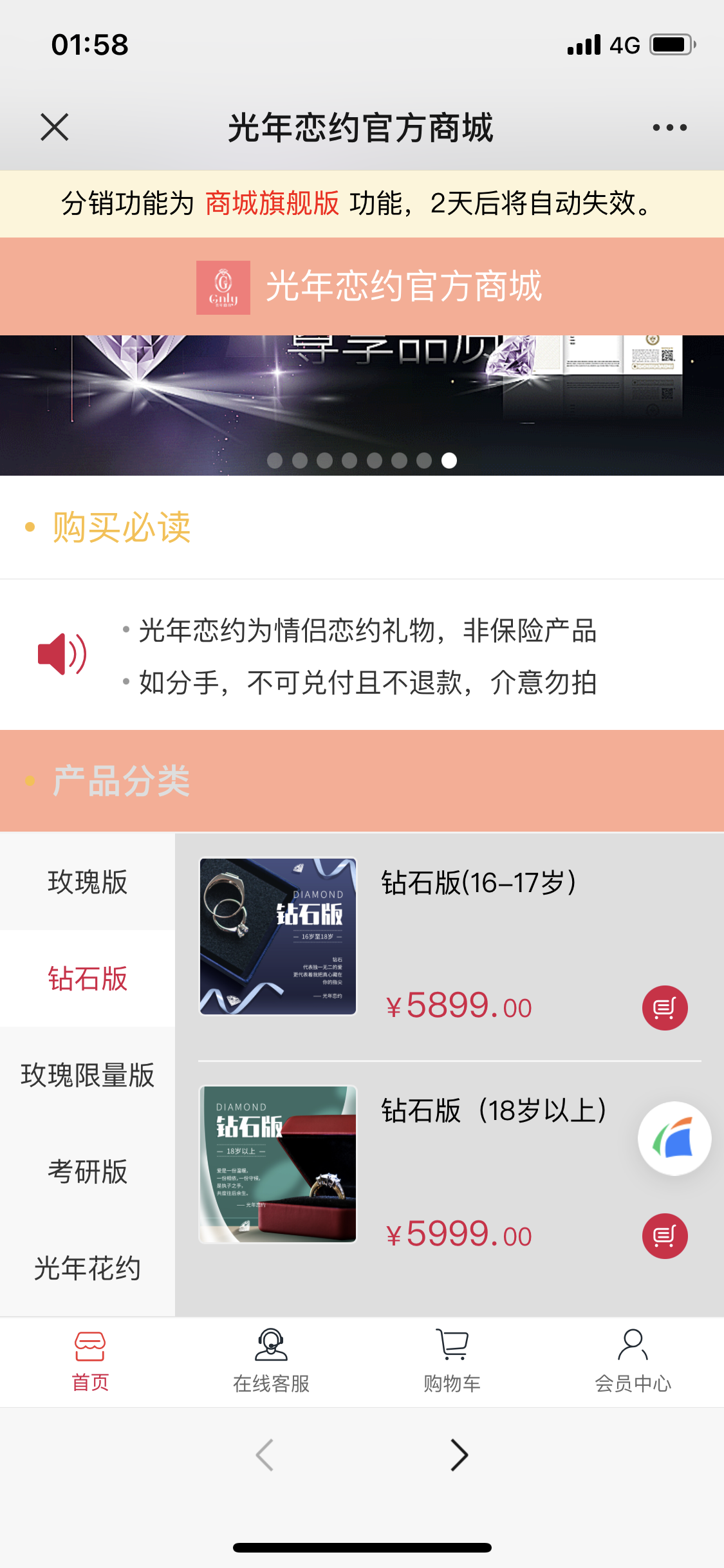 澎湃新闻记者另外注意到,“光年恋约官方商城”也有类似产品,分玫瑰版、钻石版、玫瑰限量版、考研版和光华恋约等多种类型。以玫瑰版为例,16-17岁的在校学生、现役军人下单付费239元,若3年后、25周岁生日前和心上人登记结婚,届时可兑换199朵玫瑰。若想兑换9999多玫瑰,则需下单付费11769元。若是社会人士或已满18周岁的人士购买,下单价格更高。