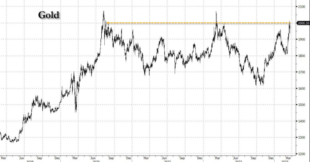 过去两周,随着欧美银行业危机蔓延,市场避险情绪急剧升温。黄金大幅飙升150美元,突破2000美元大关,为2022年3月以来首次。
