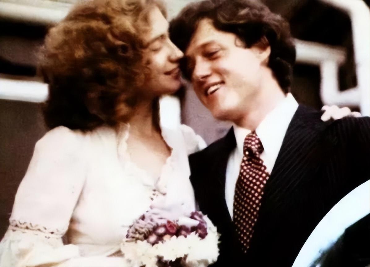 1975年,希拉里和克林顿结婚,婚礼上希拉里用手揽着克林顿的头,
