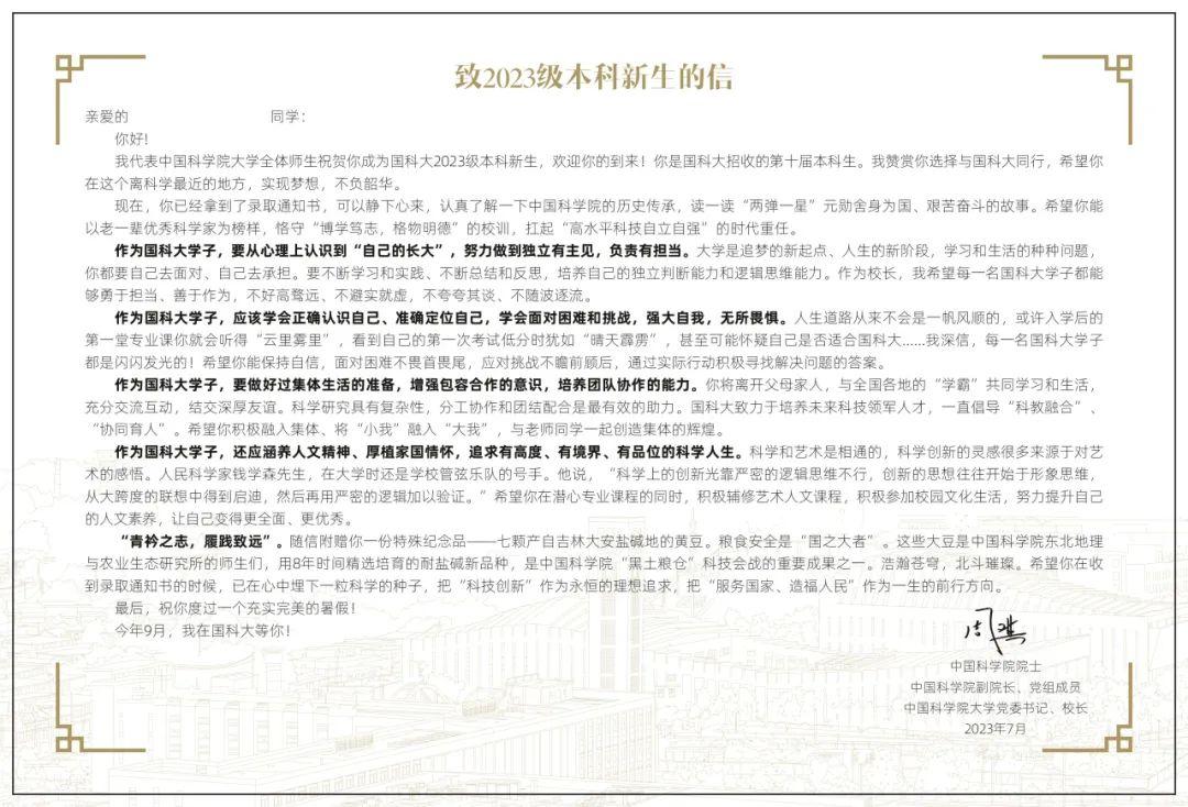 在致2023级本科新生的信中写到: