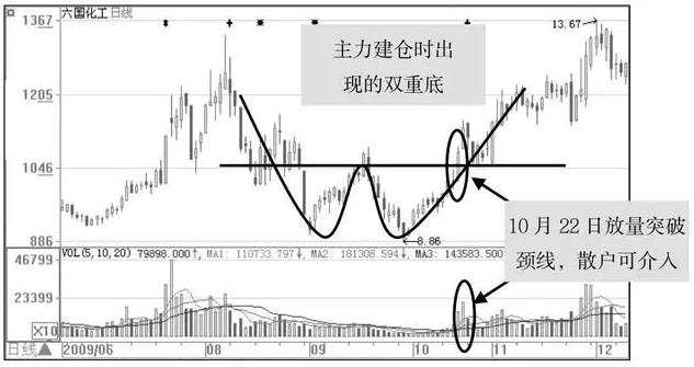 六国化工(600470)的主力在底部建仓时,走出了一个典型的双重底形态,股价于9月1日先是回落到9.12元,而后由于下跌买盘的支撑,股价又开始反弹上涨,当股价升至前期高点后,前期的跌势又导致投资者看淡后市,产生逢高出货的想法,于是造成了二次回落,最后由于看好后市的空仓者不想错过最后的买入时机,于是在股价跌至前期低点附近8.68元处又立刻买入,所以导致股价逐步上涨,10月22日当股价放量突破颈线时,说明此时主力建仓完毕,主力可介入。如图2-13所示。