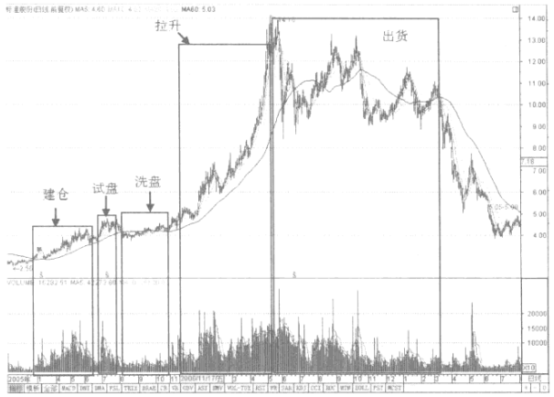 庄家建仓尾声,因为成交量及股价的变化,会引起一些投资者的注意,他们会趁机买进,等待庄家拉升获利。另外还会有一些机构资金也买进跟庄。这样即造成一部分筹码被跟风者抢走,给庄家最后的建仓和未来的拉升带来难度。庄家通常会在这个时候采取洗盘、震仓手法,洗去浮筹,震出部分跟风盘,以便于在拉升股价时降低拉升成本,保证筹码的安全性和控盘的能力。