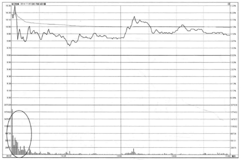 图1-1中A点的具体分析走势如图1-2所示,当日成交最为密集和集中的地方就是开盘后30分钟内,尤其是开盘高开和上冲,以及之后的急速回落,都有密集的成交量。