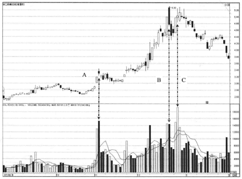 开盘后30分钟内是主力主要的对倒和减仓点。其实A点全天交易的其余时间,成交量基本以常量形态存在,在股价回升时略有放大,这里也是主力回收筹码的地方。