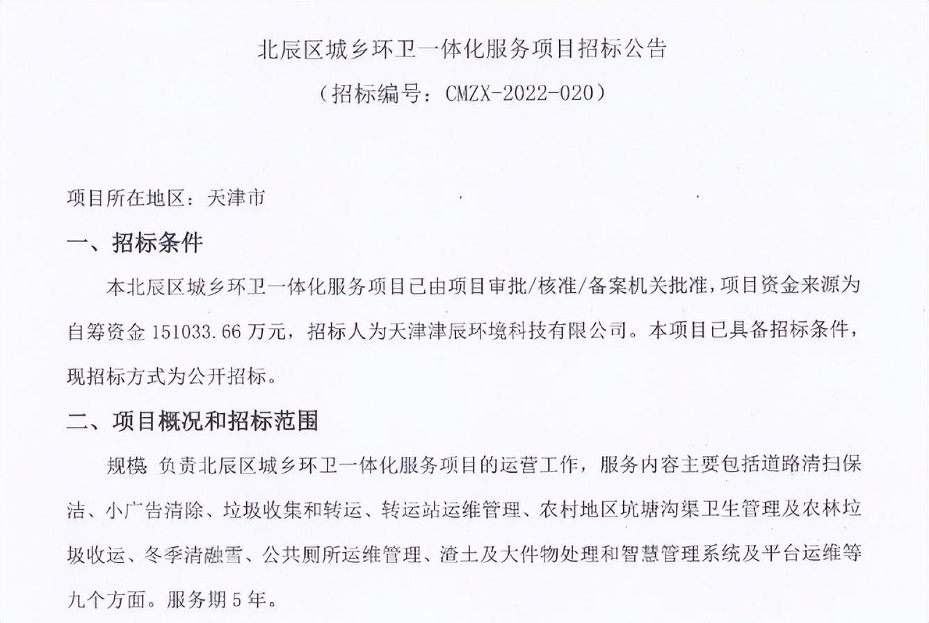 据了解,该项目于11月7日挂网招标,11月28日开标,采购预算高达53.09亿元,特许经营期15年,招标人为天津市北辰区建设开发有限公司,服务内容包括道路清扫保洁、小广告清除、垃圾收集和转运等。
