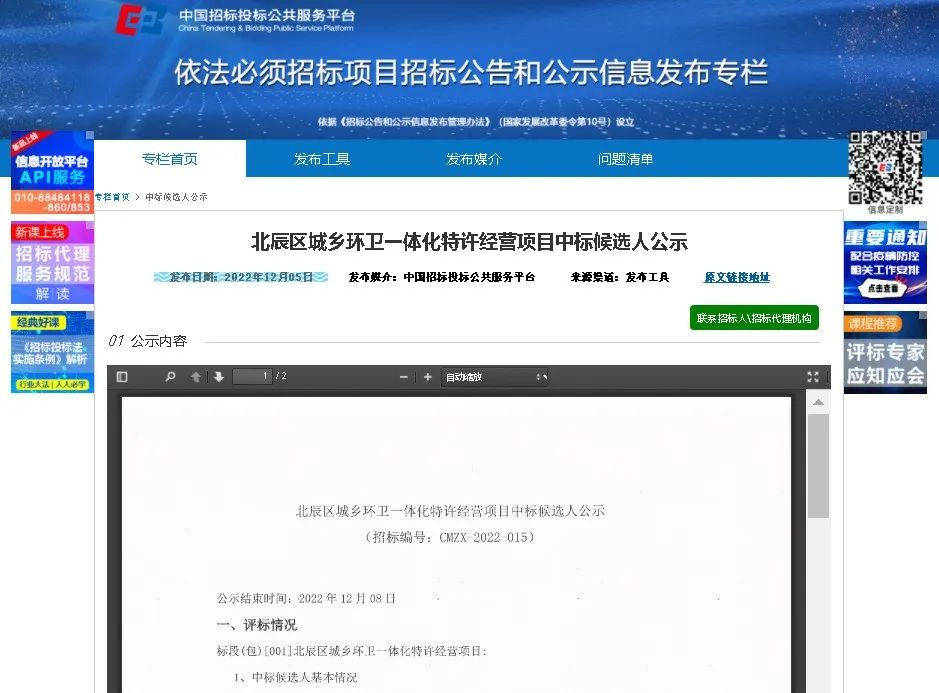 12月5日,中国招标投标公共服务平台发布了天津市北辰区城乡环卫一体化特许经营项目中标候选人公示,天津津辰环境科技有限公司(下称“津辰环境”)以53.04亿元的报价成为第一中标候选人。