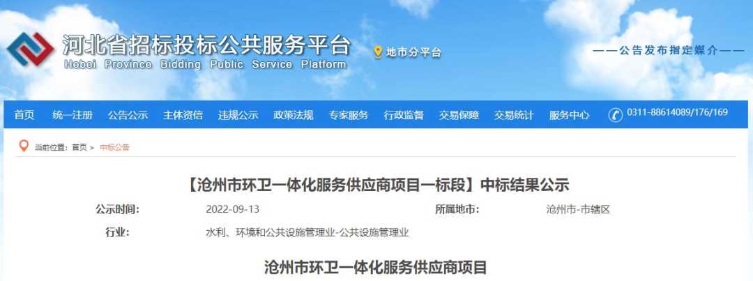 10月18日,上一个“标王”霸州市城乡环卫一体化特许经营项目
