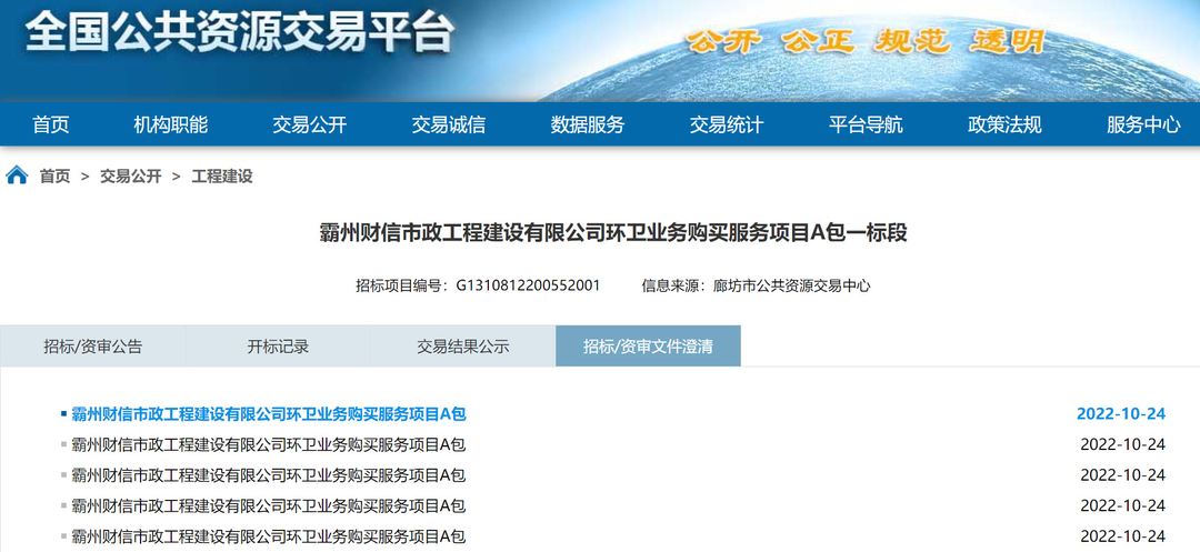 紧接着,10月24日,这个项目又被分拆为14个标段,以“霸州市环卫业务购买服务项目”的名义挂网招标,这一次霸州财信又成了招标人。