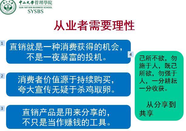 ,直销只是一种普通的盈利方式,不应该带有一夜暴富的想法,夸大宣传保健品功效无异于杀鸡取卵;