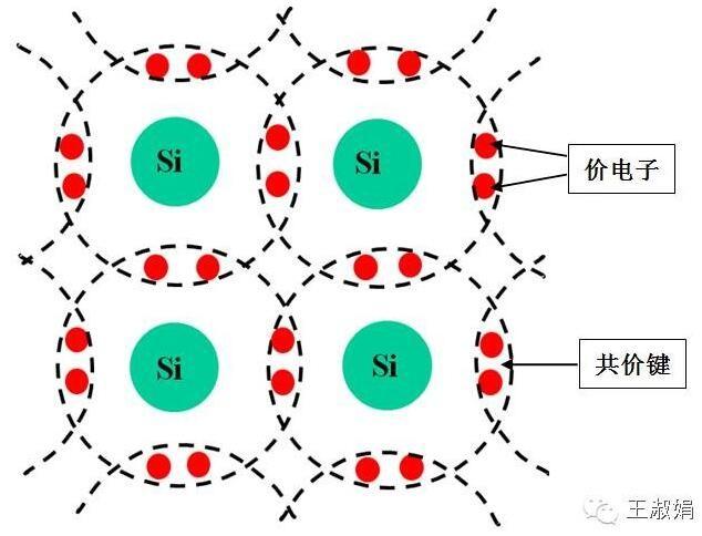 完全纯净的、具有晶体结构的半导体,称为本征半导体,原子之间形成共价键,其结构如图1-3所示。共价键中的两个电子,称为价电子。