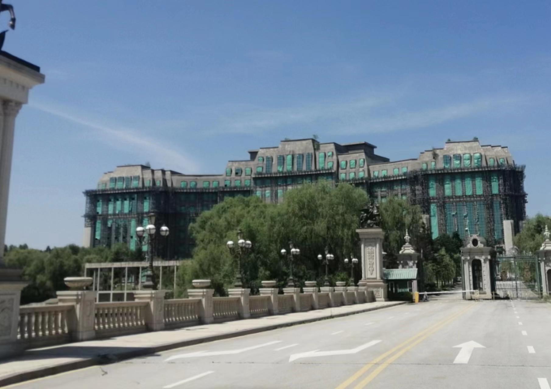 相比苦苦挣扎的事业单位和国有企业,民营经济的表现可能更符合市场规律。沿着浑河向西,沿路可见空置的楼盘。月牙岛大酒店是抚顺最有名的烂尾楼之一。这座当初宣称将建成七星级酒店的项目,烂尾已有近10年。现在入口处的杂草已有20多厘米高,铁门锈迹斑驳,保安亭前放着工人晾晒的鞋子。