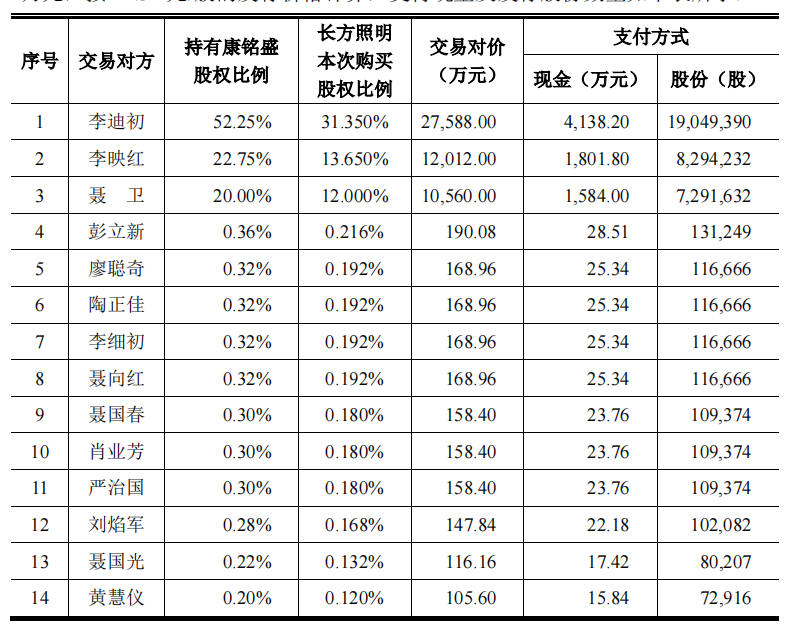 2017年12月8日,公司与李迪初、李映红、聂卫等29名自然人(以下简称“出让方”)签署了《股份转让协议》,通过现金方式以6.01亿元购买出让方持有的康铭盛35.7454%的股权。超6亿元的资金中有2.4亿元来自于定向募资。2016年,公司再度向安信基金、宝盈基金处定增募资7.6亿元,发行价格为为7.60元/股。7.6亿元的募资本拟用于“以PPP模式为主的照明节能服务项目”。 长方集团在2017年11月变更了募投项目,将节能服务项目的部分募集资金2.44亿元用于收购康铭盛的部分股权。