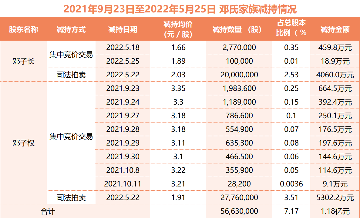 其二,根据简式权益变动报告书统计得出,在2020年12月10日至2021年7月27日、2021年9月23日至2022年5月25日两个时期,邓氏家族通过二级市场集中减持股份约3.385%,套现9808万元。