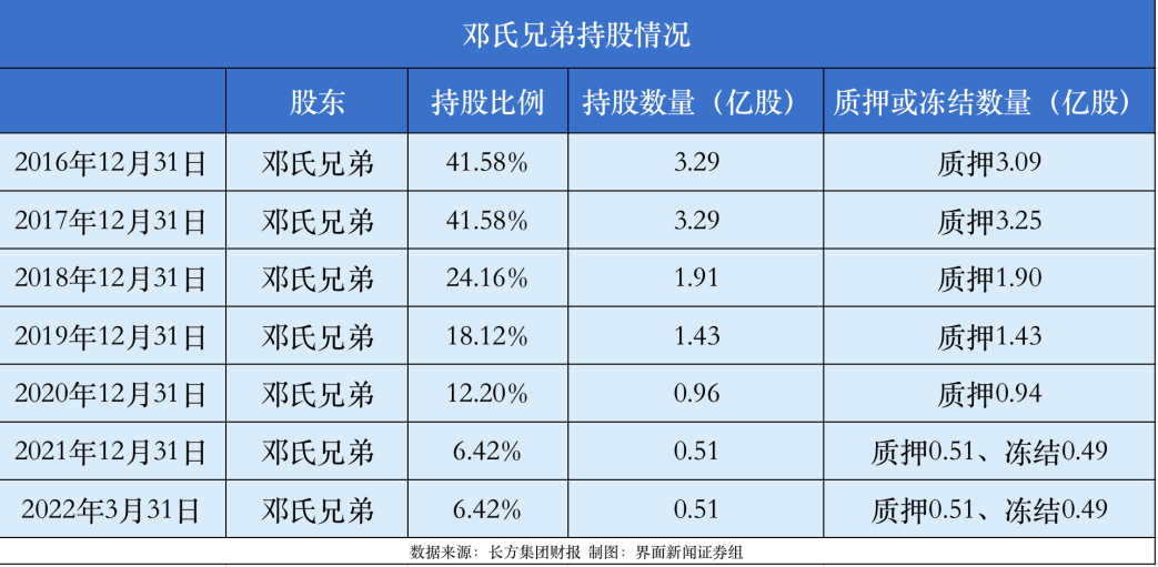 在2018年南昌光谷入主长方集团之前,邓氏兄弟合计持有长方集团41.59%的股份。