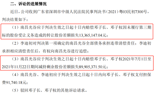 梳理公告界面新闻发现,2020年8月19日邓氏兄弟将南昌光谷告上法庭,这场官司持续了2年时间还未结束,2022年12月2日公司披露了深圳市中级人民法院下发的民事判决书,裁定南昌光谷应于判决生效之日起十日内赔偿邓氏兄弟1.03亿元。而南昌光谷就前述判决拟提起上诉。
